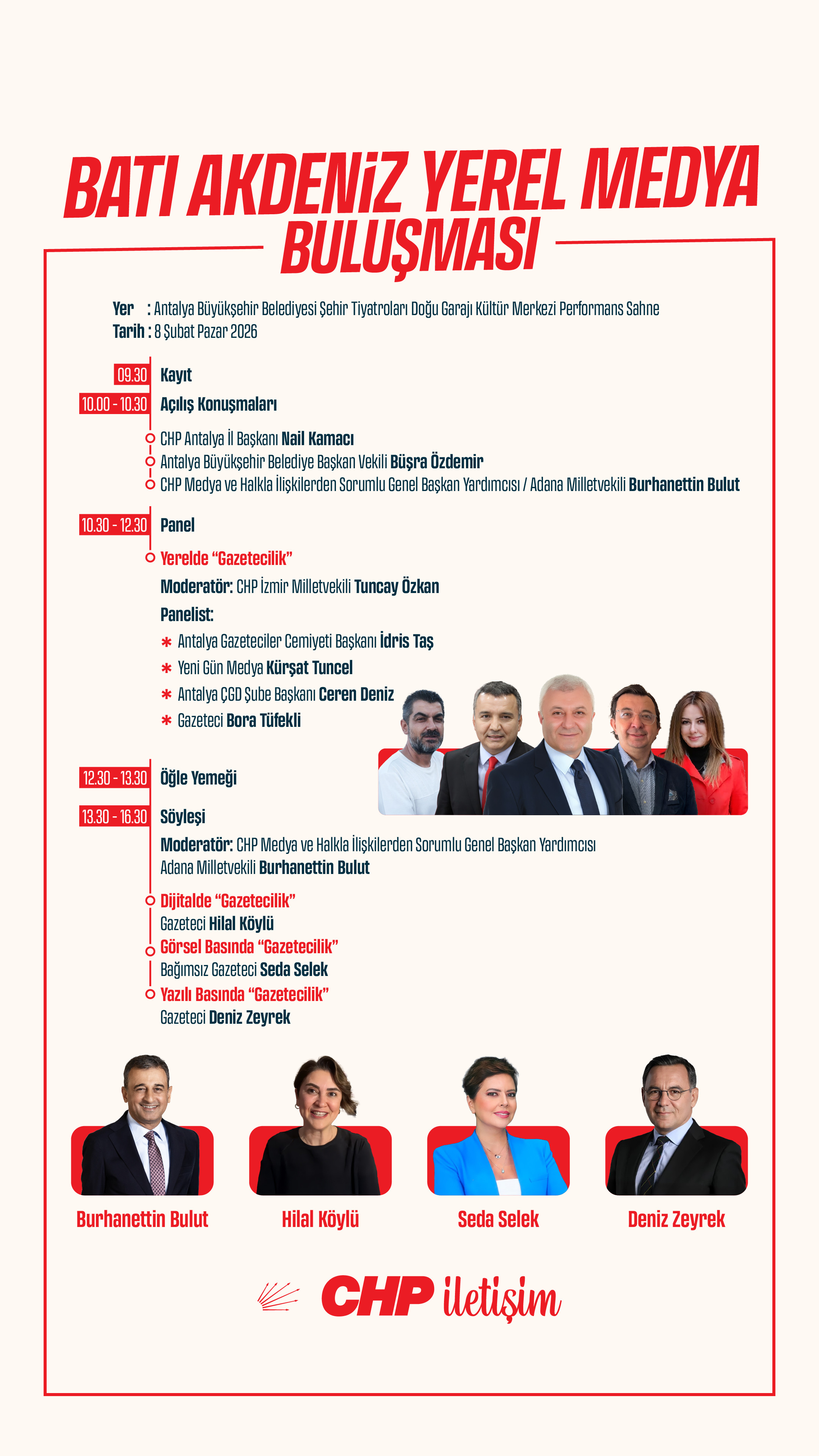 Cumhuriyet Halk Partisi (CHP) İletişim Koordinatörlüğü tarafından düzenlenen “Batı Akdeniz Yerel Medya Buluşması”, 8 Şubat Pazar günü Antalya’da gerçekleştirilecek.